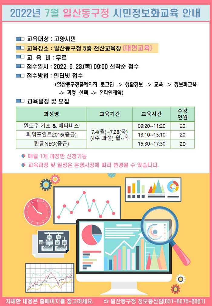 [부자동네타임즈 김인수기자] 고양시 일산동구(구청장 방경돈)는 오는 23일부터 시민정보화교육 7월 과정 수강생을 선착순 모집한다.