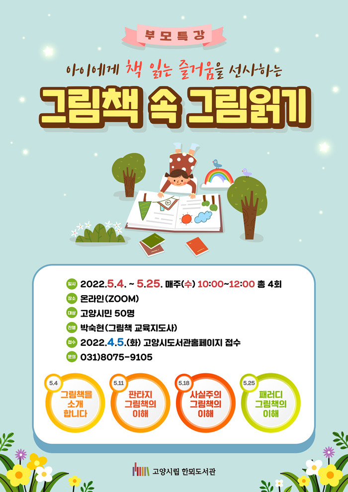 [부자동네타임즈 김인수기자] 고양시 한뫼도서관이 5월 한 달 동안 부모특강으로 아이에게 책 읽는 즐거움을 선사하는 그림책 속 그림 읽기를 온라인 운영한다.