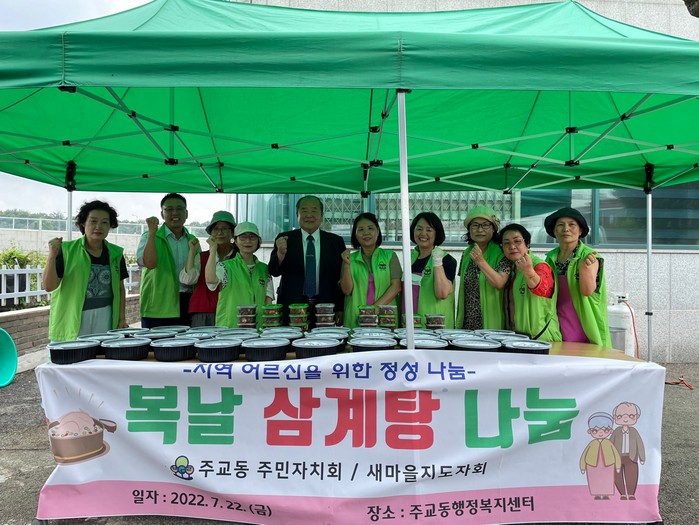 이번 나눔을 위해 주교동 주민자치회(회장 박종서) 및 새마을지도자회(회장 김태관) 회원들이 참여했으며, 한약재와 찹쌀 등을 넣어 끓인 삼계탕과 아삭한 오이 겉절이를 준비해 관내 어르신 30여 가구에 방문 전달했다.