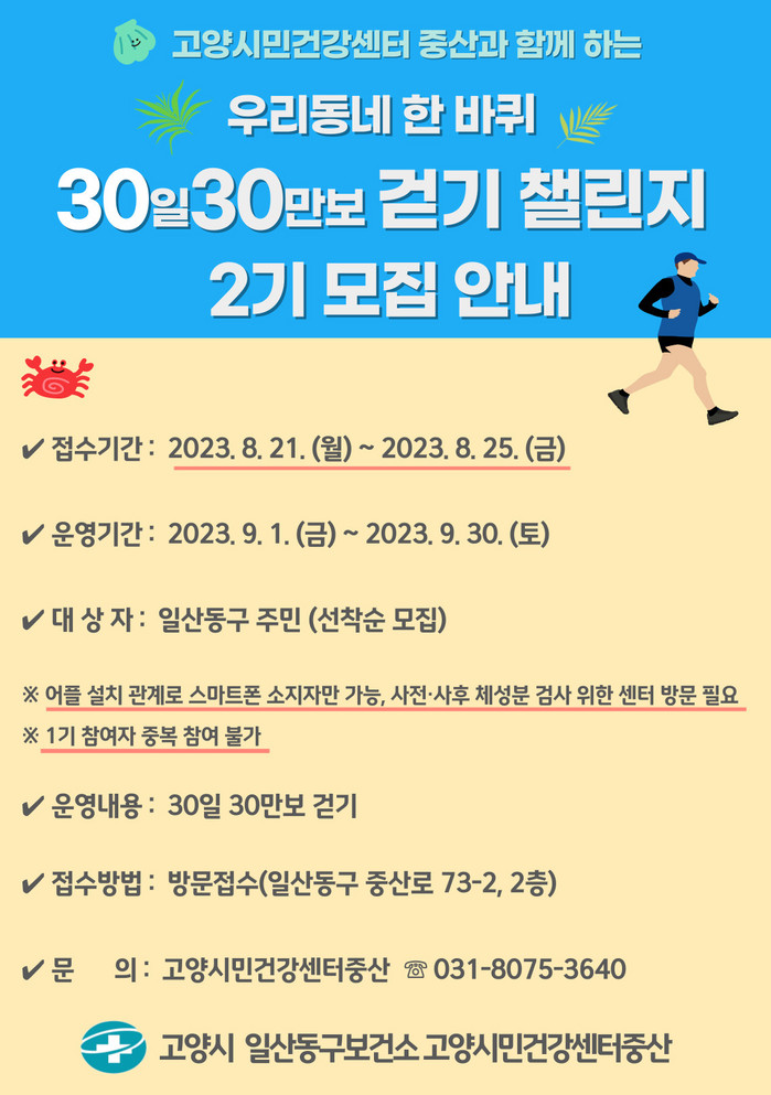[부자동네타임즈 김인수기자] 고양특례시 일산동구보건소에서 운영하는 고양시민건강센터 중산에서 지역주민의 올바른 신체활동 습관 형성을 돕는 ‘우리동네 한 바퀴 30일 30만보 걷기 챌린지’프로그램의 2기 대상자를 8월 21일(월)부터 25일(금)까지 모집한다.