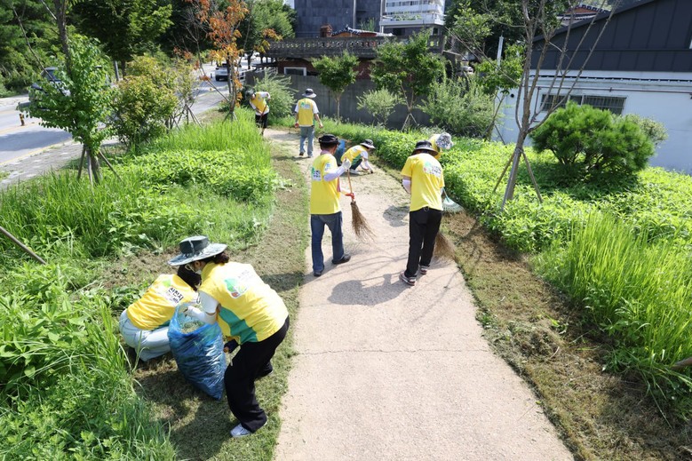 이날 활동에는 봉사자 20명이 참여해 대형 예초기 3대를 동원한 풀베기와 보도블록 틈새의 잡초는 손으로 하나하나 뽑았다. 관광객들이 남긴 쓰레기와 담배꽁초 100L 상당을 수거했고 얼음물 나눔으로 폭염 속 주민과 방문객에게 시원함을 선사했다.