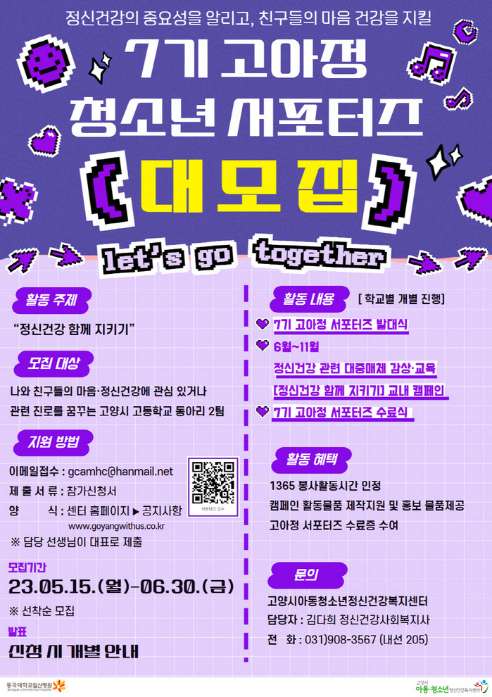 [부자동네타임즈 김인수기자] 고양시 아동청소년정신건강복지센터에서 고양시 관내 고등학생을 대상으로 고아정 서포터즈 7기를 모집한다. 서포터즈는 청소년들의 마음 건강을 지키기 위한 캠페인을 기획하고 진행하는 역할을 수행한다.