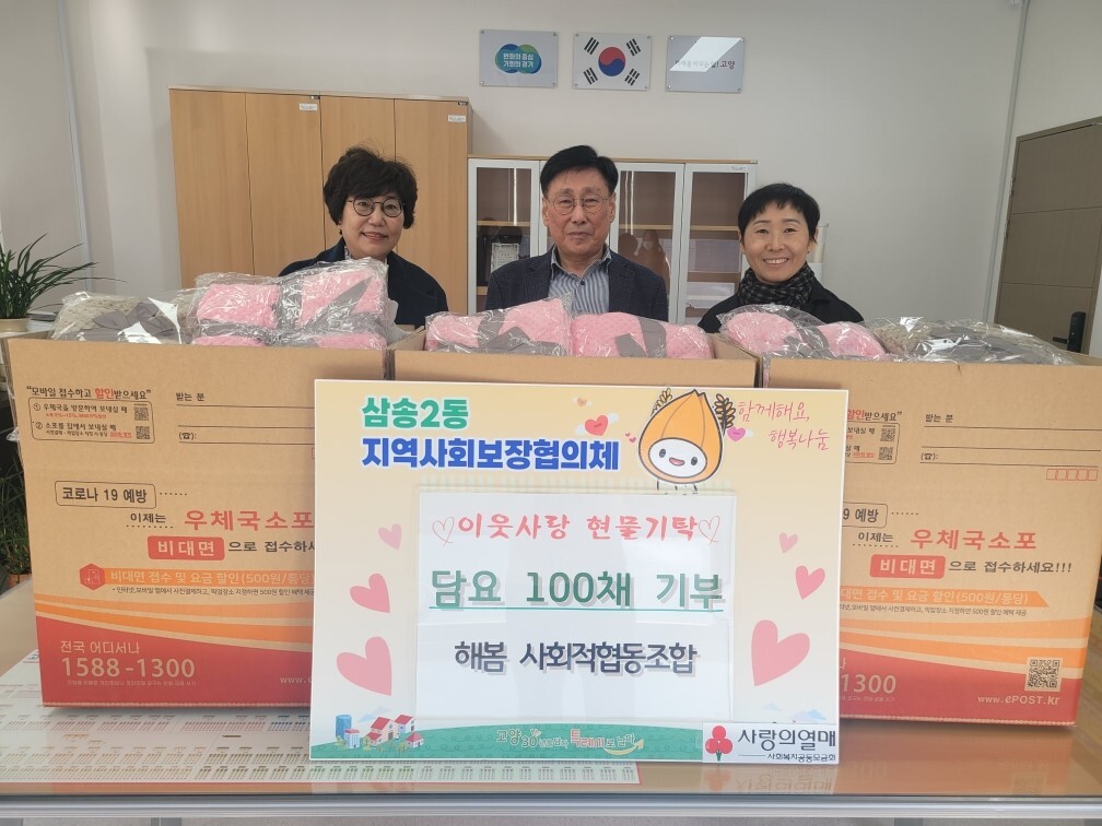 [부자동네타임즈 = 김인수 기자] 고양특례시 삼송2동 행정복지센터는 지난 27일 해봄 사회적협동조합으로부터 독거어르신 등 취약가구를 위한 무릎담요 100채를 전달 받았다고 밝혔다. 해봄은 어려운 이웃이 추운 겨울을 따뜻하고 건강하게 나기를 바라는 마음에 무릎담요를 직접 제작해 기부했다.