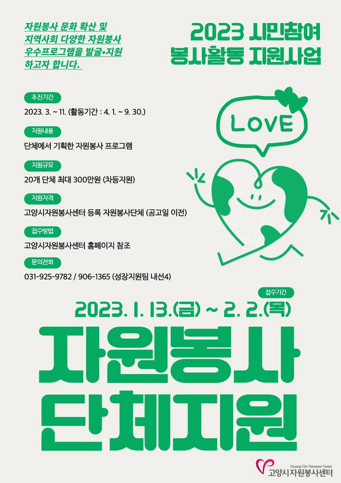 고양시자원봉사센터, 2023 시민참여 봉사활동 지원사업 공모.