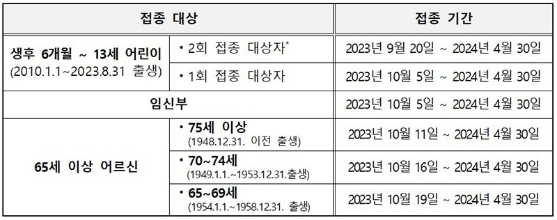 인플루엔자 예방 접종의 경우 연령마다 접종 시작일이 달라 주의가 필요하다. 생후 6개월~13세 어린이는 1회 접종 대상자의 경우 10월 5일부터, 2회 접종 대상자의 경우 9월 20일부터 접종이 시작됐다. 임산부의 경우 10월 5일부터 접종이 시작됐다. 65세 이상의 어르신의 경우 10월 11일부터 순차적으로 접종이 시작된다.