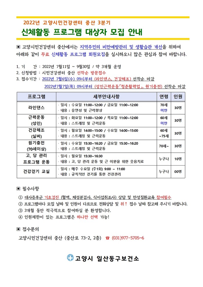 [부자동네타임즈 김인수기자] 고양시 일산동구보건소가 코로나19로 인해 중단된 고양시민건강센터를 1년 6개월 만에 재운영한다. 보건소는 7월 6일부터 건강증진을 위한 운동 프로그램 참여자를 모집한다고 밝혔다.