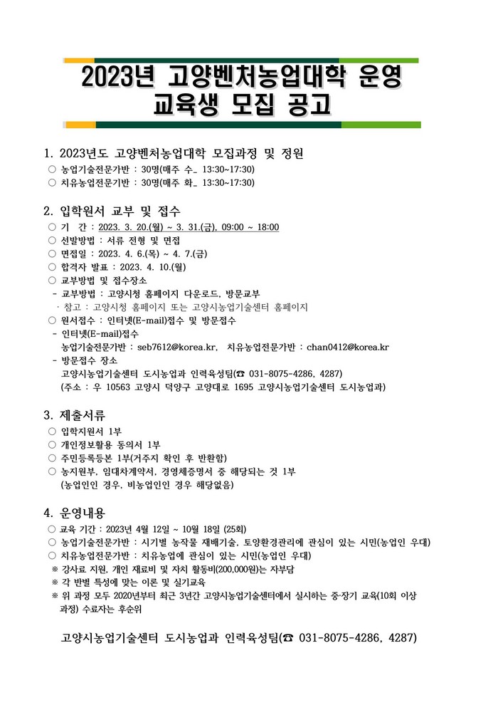 과정별 교육일정과 모집에 대한 자세한 사항은 홈페이지를 참고하고, 궁금한 사항은 고양시농업기술센터 도시농업과 인력육성팀으로 문의하면 자세히 안내 받을 수 있다.