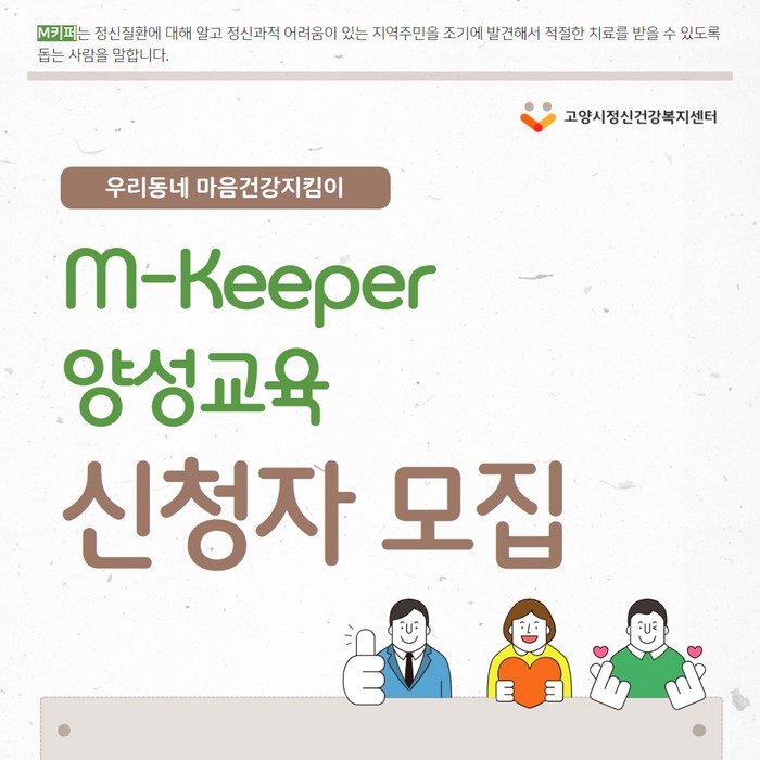 [부자동네타임즈 김인수기자] 고양시정신건강복지센터(센터장 이정석)에서 우리동네 마음건강지킴이 ‘M키퍼’ 양성교육 참여자를 상시 모집한다.