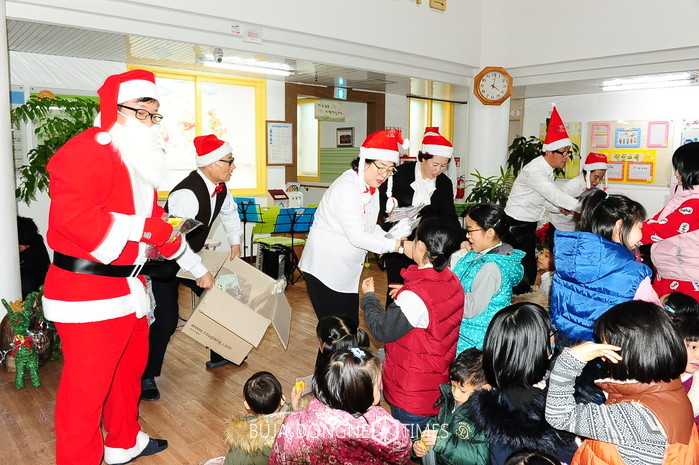 | △빛고을타운 직원들은 싼타복장을 하고 수익금으로 준비한 빵, 간식, 선물 등을 전달했는데 선물과 간식을 사회적 기업에서 구입해 행사의 의미를 더했다 |