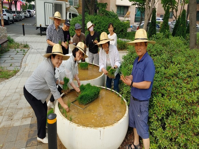 이번 행사에 주민자치회 위원, 지역 의원 등 10여 명이 함께 참여하여 대형화분 14개에 정성스럽게 물을 대고 모를 심었다.