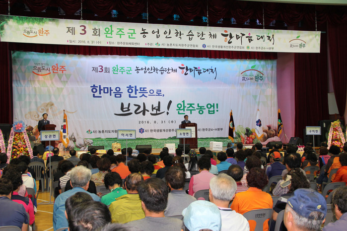 [완주-부자동네타임즈 이정술 기자] 완주군은 지난 8월 31일 완주문화체육센터에서 「한마음 한뜻으로, 브라보! 완주농업!」이란 주제아래 박성일군수를 비롯한 정성모의장, 도의원, 군의원들과  농촌지도자회, 생활개선회, 4-H본부회원 등 500여명이 참석한 가운데 제3회 농업인학습단체 한마음대회를 개최했다.