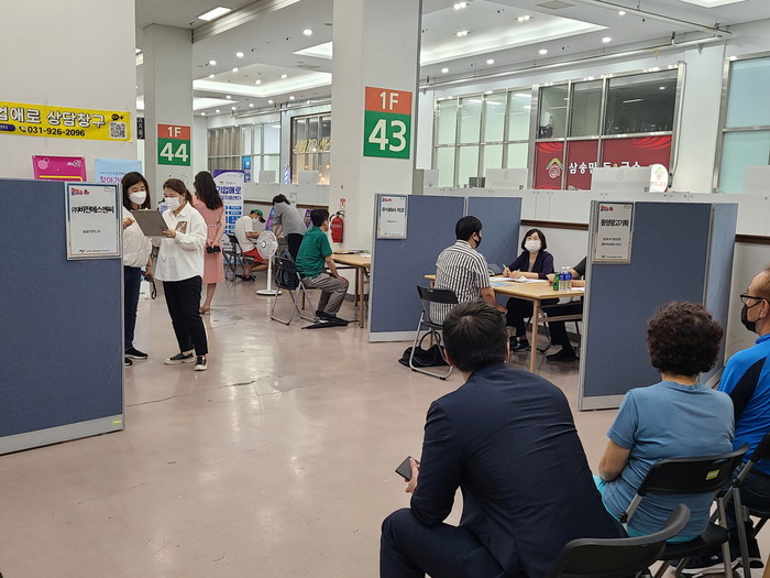 [사진설명] 고양 삼송테크노밸리에서 열린 찾아가는 일자리 박람회에서 구직자들이 현장면접에 참여하고 있다.