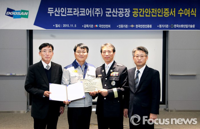 [부자동네타임즈 이채봉 기자] 두산인프라코어는 6일 군산공장이 국민안전처로부터 공간안전인증을 받았다고  밝혔다.