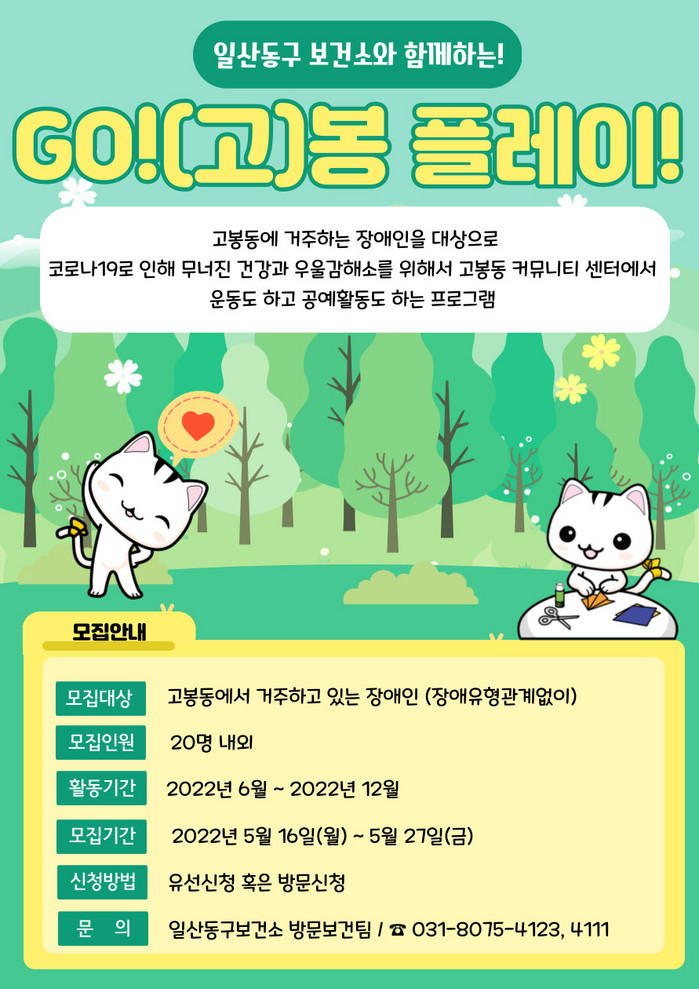 [부자동네타임즈 김인수기자] 고양시 일산동구보건소가 2022년 장애인 재활·운동 프로그램 ‘GO(고)봉 플레이!’ 신규 대상자를 모집한다.