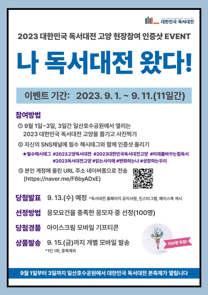 이벤트 ‘나 독서대전 왔다’은 9월 1일부터 11일까지 운영된다. 참여방법은 축제 현장을 배경으로 찍은 인증 사진을 필수 해시태그(#2023고양독서대전 #2023대한민국독서대전고양  #미래를바꾸는힘독서 #읽는사이에 #변화하는나 #성장하는우리)와 함께 자신의 페이스북이나 블로그 등 소셜미디어(SNS)에 올리고 링크 주소를 네이버폼으로 제출하면 된다.