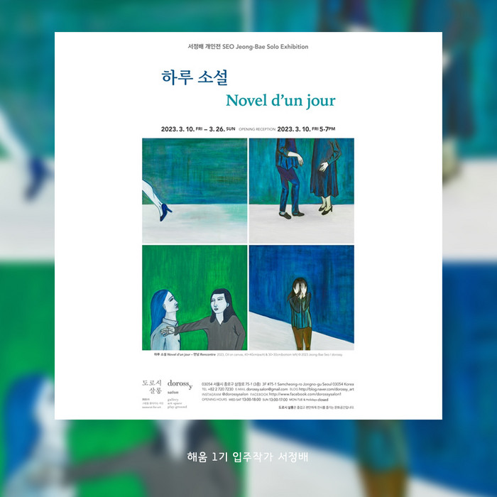 해움의 서정배 작가가 개인전 바톤을 이어받는다. 서정배 작가의 전시 하루 소설은 갤러리 ‘도로시살롱(서울 종로)’에서 3월 10일부터 3월 26일까지 열린다. 작가로서의 일상에서 느낀 외로움과 고독, 불안 등을 소설을 읊듯 담담하게 그려낸 전시다.