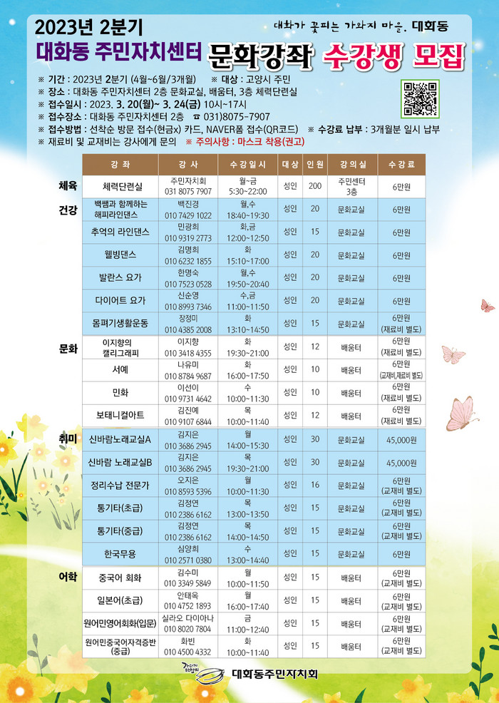 고양시 대화동 주민자치센터, 2023년 2분기 문화강좌 수강생 모집.