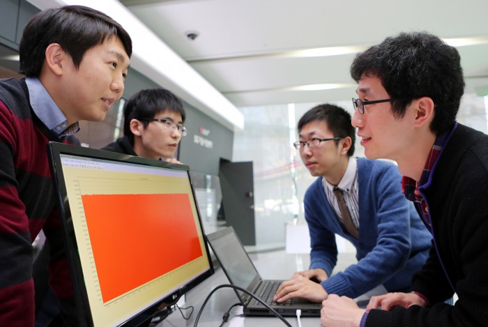 △ LG유플러스 직원들이 기가 LTE 속도를 시연하고 있다.<사진제공=LG유플러스>