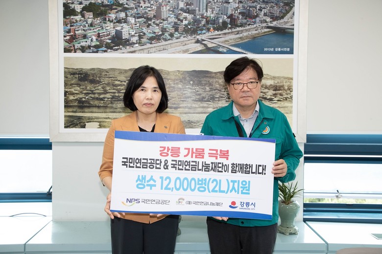 국민연금공단(이사장 김태현)과 국민연금나눔재단(이사장 강흥구)은 최근 극심한 가뭄으로 재난사태가 선포된 강릉시(시장 김홍규)에 5일 2리터 생수 12,000병을 긴급 지원했다.