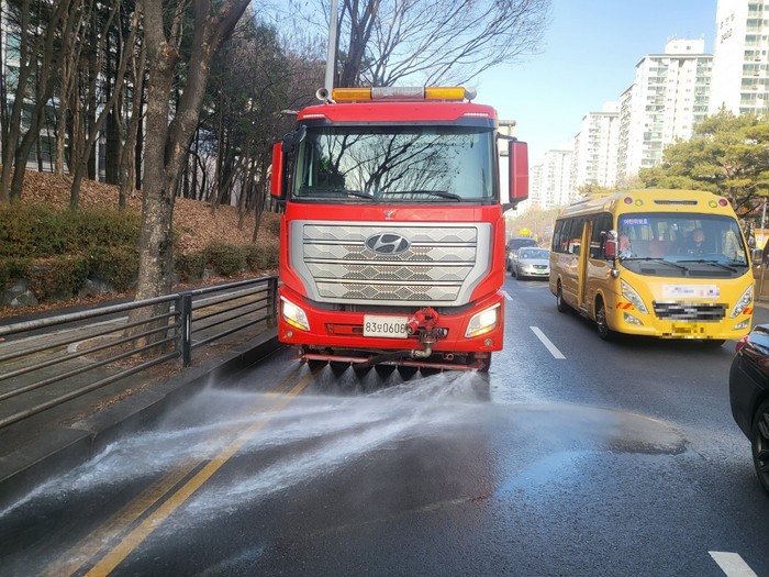 [사진설명] 살수차량이 도로에 물을 뿌리고 있다.