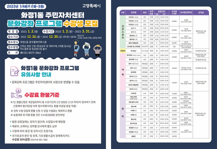 [부자동네타임즈 김인수기자] 고양특례시 화정1동 주민자치회는 내년 1월 2일부터 3월 31일까지 3개월 과정으로 2023년 1분기 문화강좌를 운영한다.