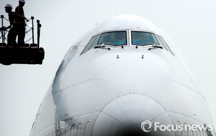 △ 공항 격납고 밖에서 점검을 위해 대기 중인 화물기로 정비사를 태운 크레인이 접근하고 있는 모습. <사지넺공=포커스뉴스>
