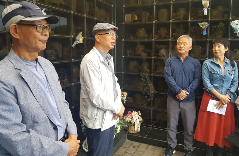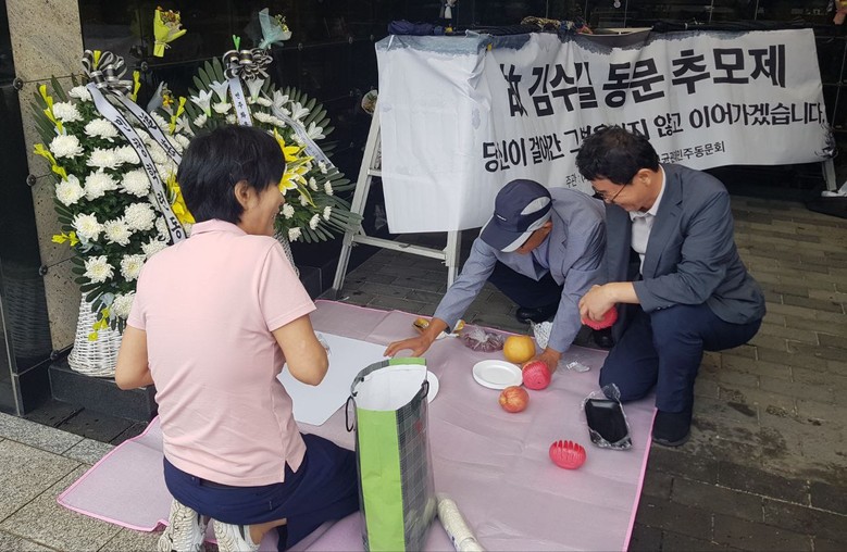 ▲지난 9월 21일(토) 광주시 오포리에 있는 분당추모공원 휴에서 고 김수길 민청학련 회원 겸 성대출신 민주인사 5주기 추모제에서 여동생 등 참석자들이 제물을 놓고 있다.