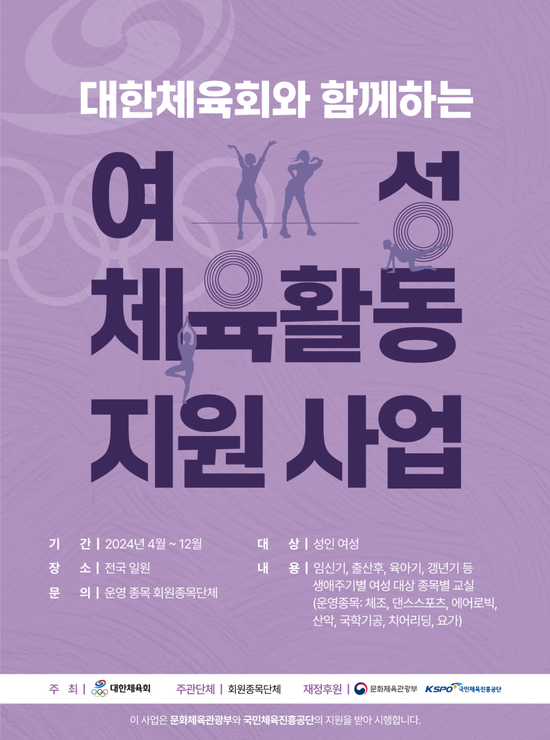 [부자동네타임즈 = 김인수 기자] 대한체육회(회장 이기흥)는 여성체육활동지원 사업의 일환으로 운영하고 있는 임신기·출산기·육아기·갱년기 등 여성 생애주기별 맞춤형 스포츠 교실의 2024년 참가자를 모집한다.