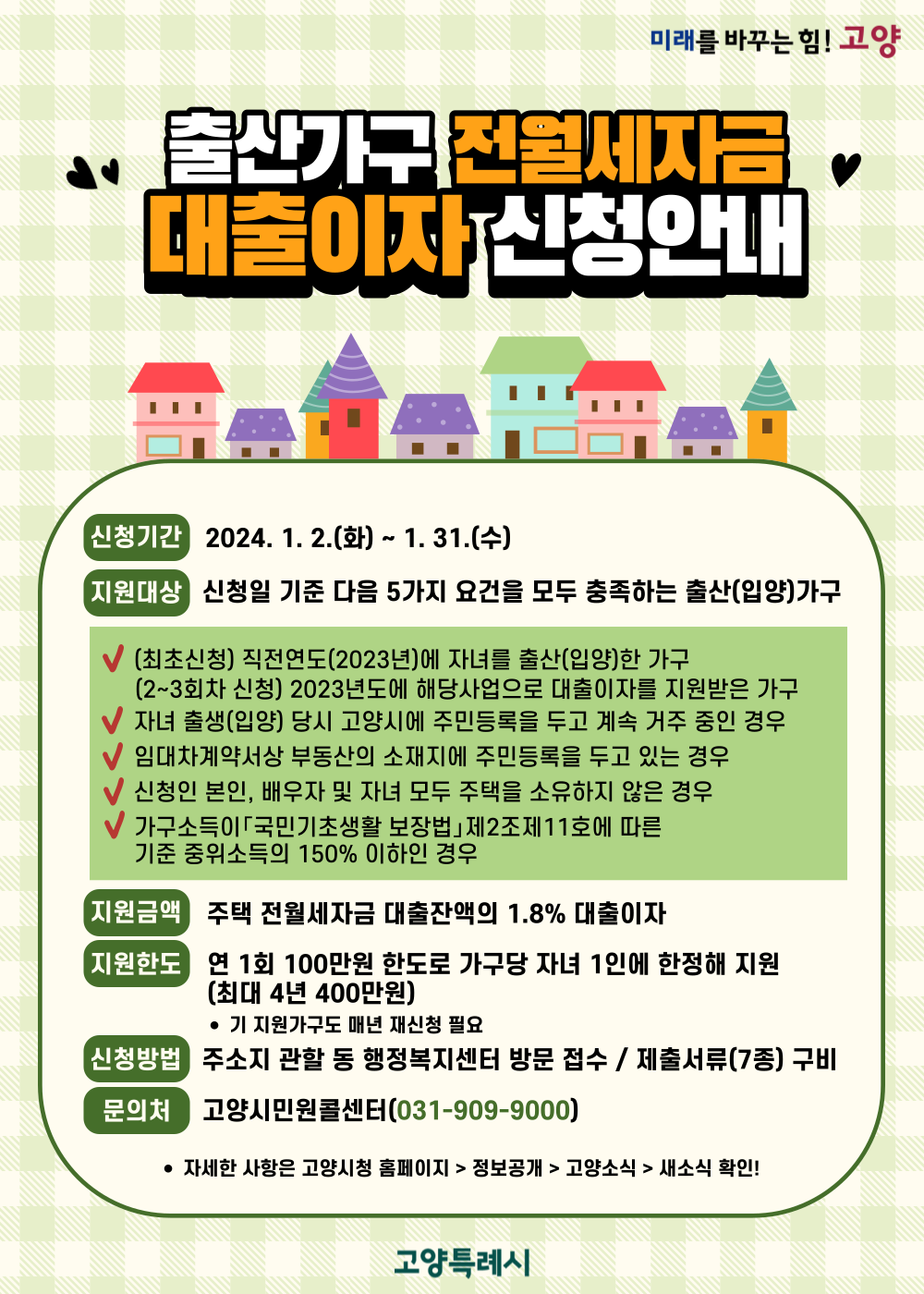 [부자동네타임즈 = 김인수 기자] 이번 달 31일(수)까지 약 1개월 동안 무주택 출산가구의 주거비 부담을 경감하고 안정된 주거환경을 조성하기 위해 ‘2024년 고양시 출산가구 전월세자금 대출이자 지원 사업’신청을 받는다.