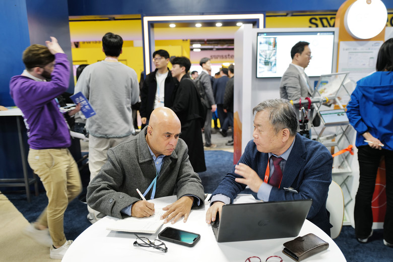 ▲1월 10일(현지시각) 미국 라스베이거스에서 개최된 CES 2024에서 한국수자원공사관에 참여한 협력 기업 ‘스페이스맵’이 비즈니스 미팅을 진행하고 있다.