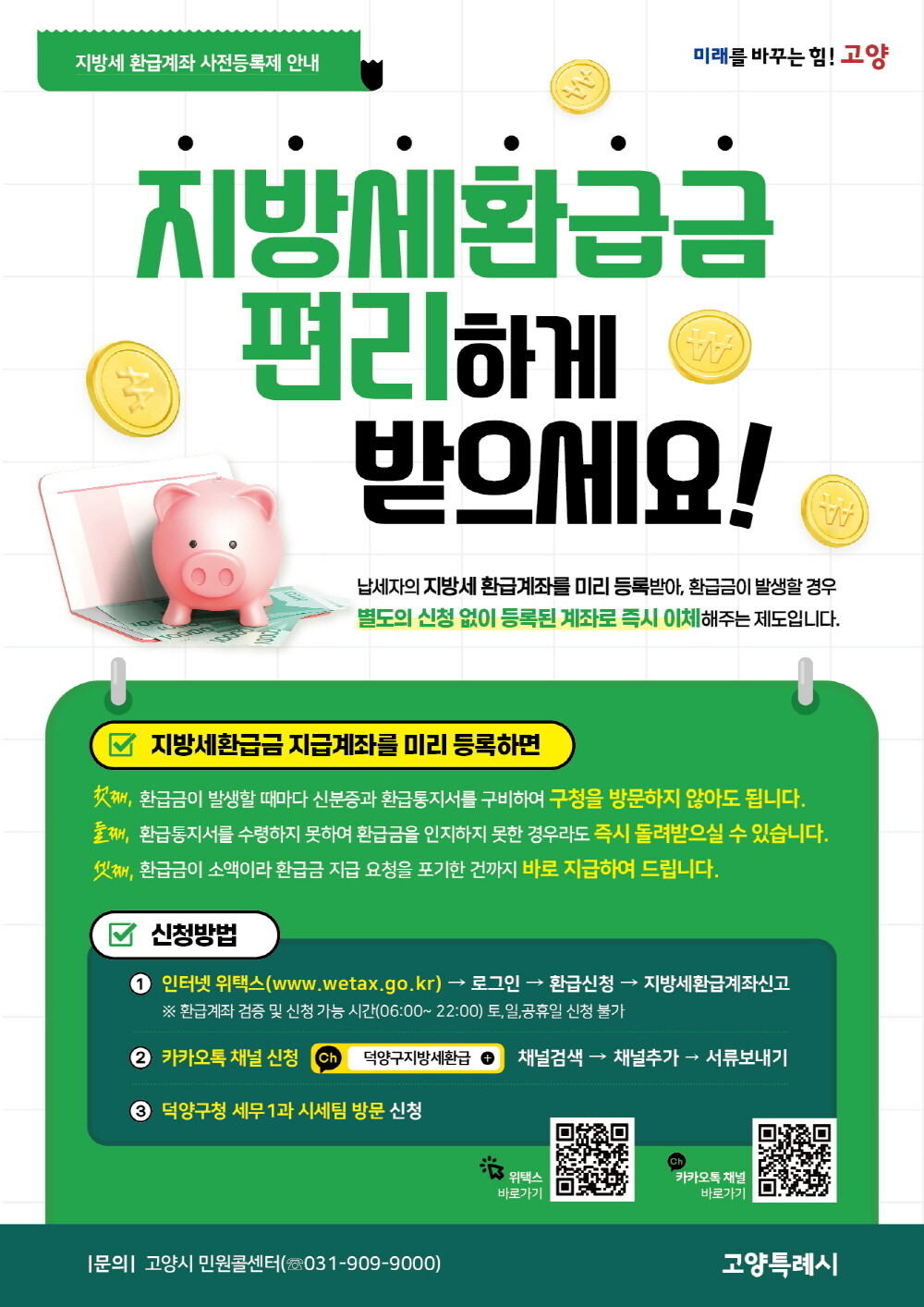 한편, 환급계좌 신청은 인터넷(위택스 www.wetax.go.kr)을 통해 환급계좌를 신고하거나, 환급금 지급계좌 개설 신고서를 작성해 카카오톡 채널(ID: 덕양구지방세환급)로 편리하게 신청할 수 있으며 덕양구청 세무1과 방문 신청도 가능하다.