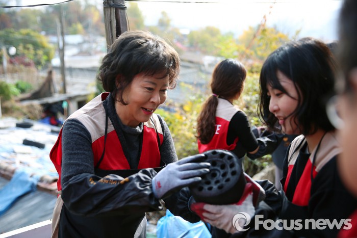 | △ 롯데장학재단은 11일 서울 정릉동 독거노인과 저소득층 250가구에게 연탄 5만장과 쌀 250포를 기부했다. 신영자 이사장(왼쪽)이 롯데 장학생들과 함께 연탄을 전달하고 있다.<사진제공=롯데장학재단> |