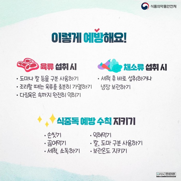 이밖에 날고기와 오염된 달걀 등에서 검출되는 살모넬라균과 해산물을 통한 비브리오균 감염도 주의해야한다.