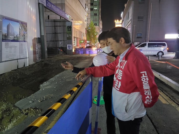 이동환 후보는 지난 31일 밤 11시 화정역 광장 피날레유세와 일산 라페스타 거리유세를 마치고, 백석동 오피스텔 신축현장 인근에서 발생한 싱크홀 현장을 방문해 안전점검에 나섰다.