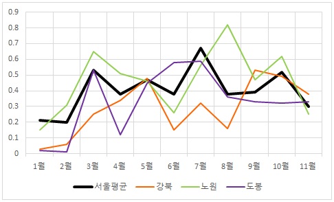 △ 서울 노도강(노원·도봉·강북) 지역 아파트 매매 월간 변동률 추이(%). <자료출처=부동산114>