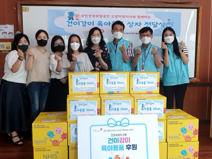 이번 후원은 공단 창립 22주년과 노인장기요양보험 14주년을 맞아 국민건강보험공단 임직원으로 구성된 ‘건이강이 봉사단’이 추진했다. 건이강이 봉사단은 저출산 사회에서 저소득 취약계층의 영유아 보육과 출산을 지원하기 위해 ‘건이강이 육아용품’을 후원하고 있다. 건이강이 육아용품은 출산 이후 영유아 양육에 필요한, 기저귀, 목욕용품 등 7개 품목과 영유아 건강검진 안내문, 응원 카드 등으로 이루어져 있다.