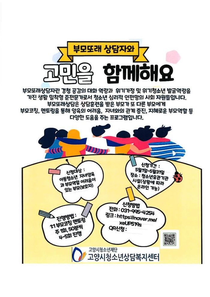 - 고양시청소년상담복지센터, ‘부모또래상담자와 고민 나눌 아동청소년 부모(보호자)’-신청자 모집.