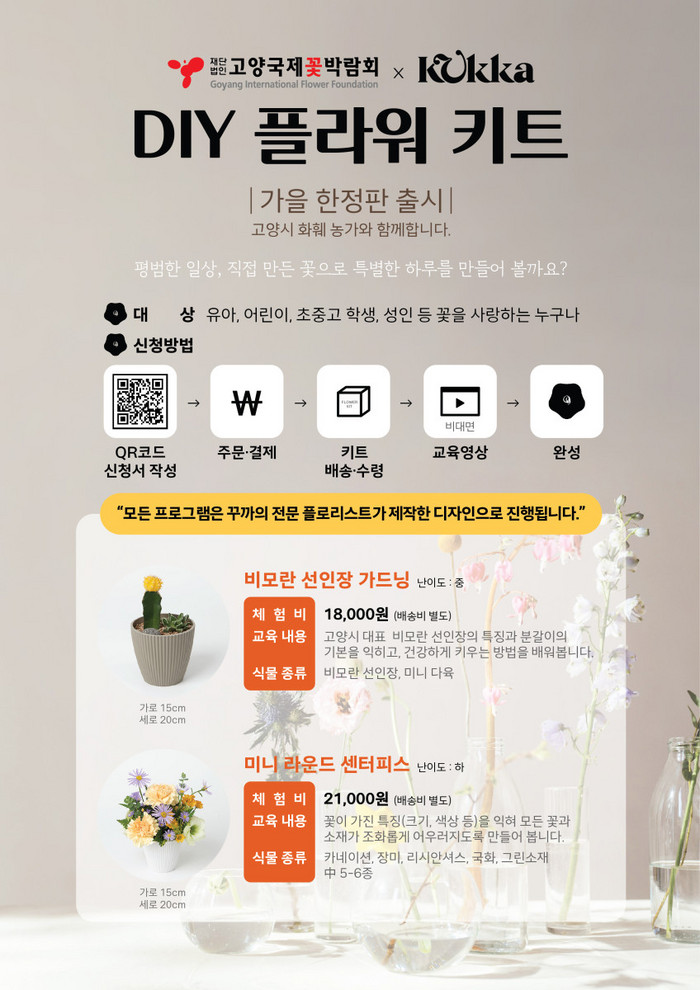 2020년도부터 꽃박람회 재단에서 진행하여 학교·기관에서 큰 호응을 얻은 DIY 플라워 키트를 꾸까와 협업하여 새롭게 개발하였다. 모든 키트는 생화로 구성되며 고양시에서 다수 재배되며 우리나라 대표 화훼 수출 상품인 비모란 선인장 가드닝, 브리티쉬 스타일 햇박스, 가을 국화 핸드타이드 꽃다발 등 다양한 프로그램이 마련되어 있다. 꾸까의 전문 플로리스트가 진행하는 전문적인 강의 영상이 제공되어 누구나 쉽고 간편하게 만들어 볼 수 있다. 플라워 키트는 꾸까 홈페이지에서 구매할 수 있다.