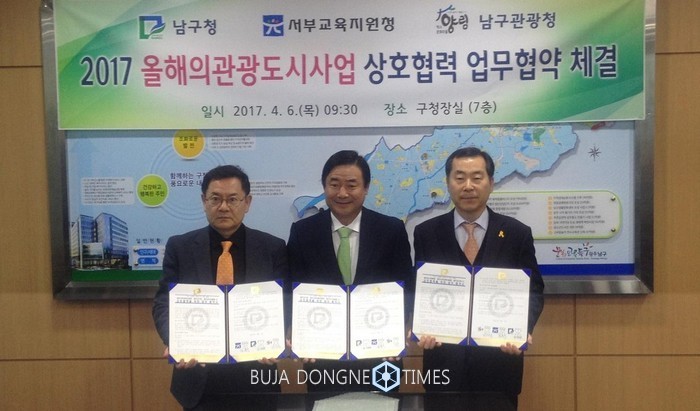 광주광역시서부교육지원청(교육장 김흥식)이 6일 남구청(구청장 최영호), 남구관광청(단장 박선정)과 함께 '2017 올해의 관광도시 사업' 활성화를 위한 업무협약을 체결했다.