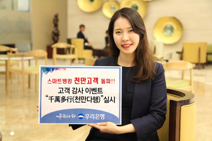 | △ 우리은행 모델이 스마트뱅킹 가입고객 1000만명 돌파를 기념해 '천만고객이 행복해지는 천만다행(千萬多幸) 감사 이벤트'를 알리는 문구를 들고 있다. <사진제공=우리은행> |