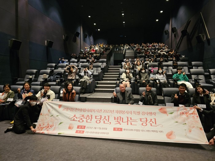 [부자동네타임즈 김인수기자] 고양시문촌9종합사회복지관(관장 김신실)은 3월 17일 금요일, 롯데시네마 주엽점에서 자원봉사자 특별 감사행사‘소중한 당신, 빛나는 당신’을 진행했다.