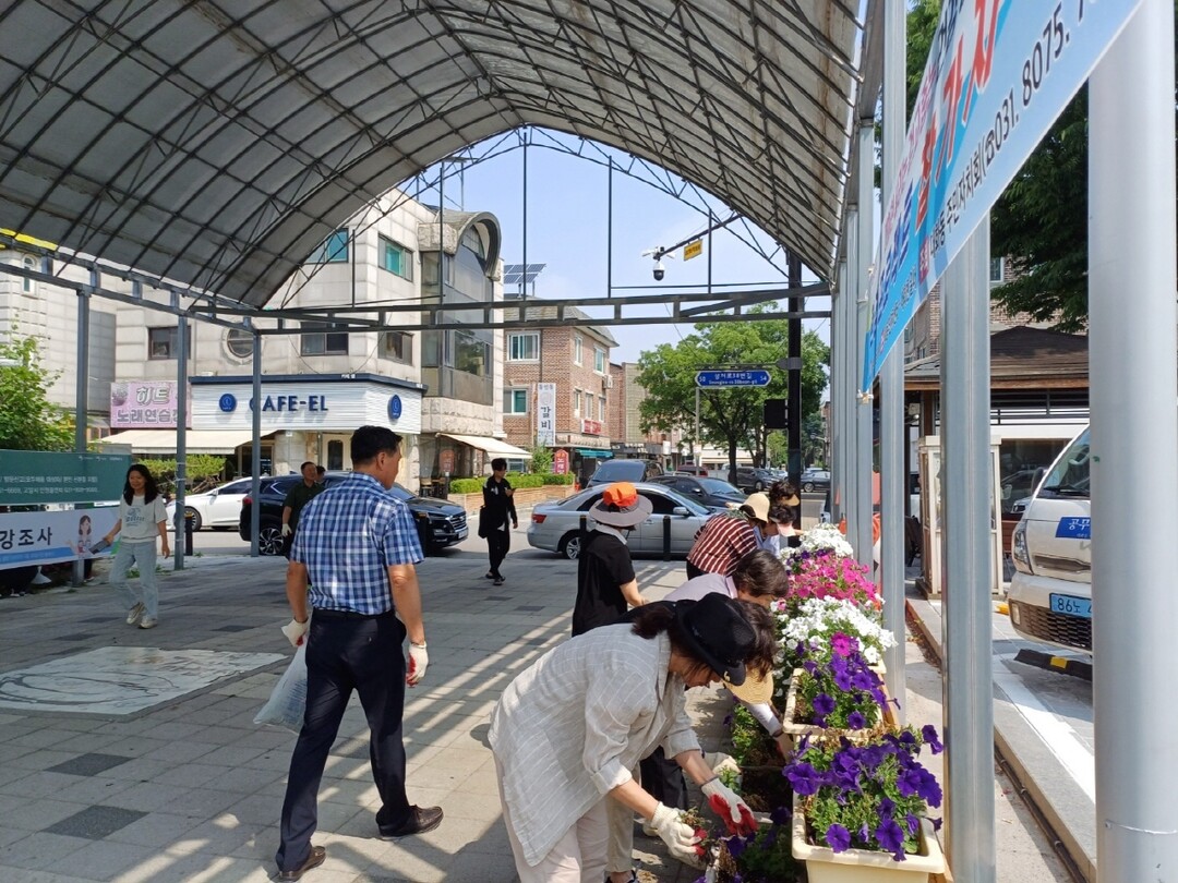 이번 활동에서는 지난 4월 통장과 직능단체 회원들이 식재한 페튜니아와 청사 새 단장 기념식수 ‘토리’ ‘벼리’와 청사 화단에 물을 주고 제초작업을 실시했다.