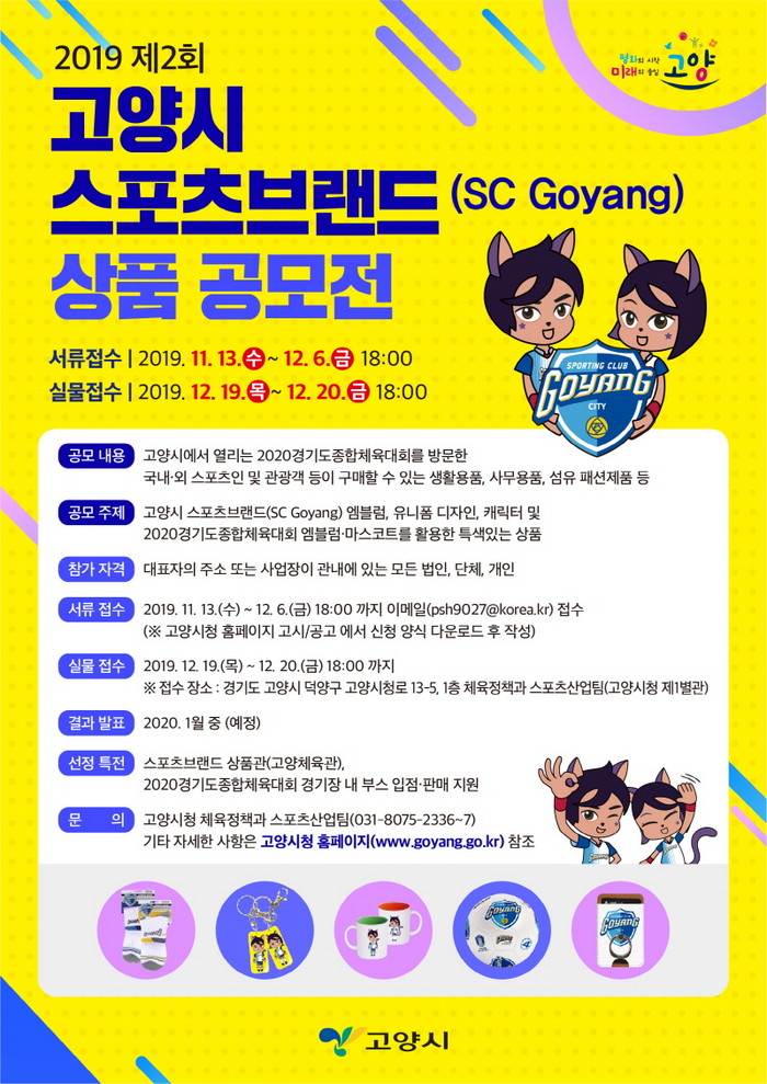 실물(상품)은 12월 19일(목)~20(금) 2일간 고양시청 체육정책과 스포츠산업팀으로 직접 제출하면 된다. 신청양식 등 자세한 사항은 고양시청 홈페이지 ‘열린시정–고시.공고’를 참고하면 확인 가능하다.