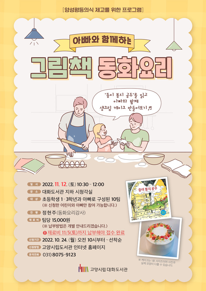 프로그램은 초등 1~3학년 어린이와 아빠로 구성된 10팀을 대상으로 11월 12일 토요일 오전 10시 30분부터 12시까지 대화도서관 지하 시청각실에서 진행된다. 정현주 동화요리강사가 강의를 진행한다.