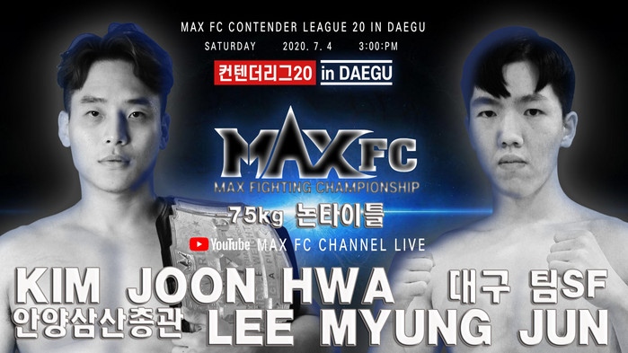 MAX FC 미들급 챔피언 '비스트' 김준화(30, 안양 삼산 총관)가 코로나19로 침체된 입식격투계에 활력을 불어 넣는다. 7월 4일 김준화는 대구시 대백프라자에서 열리는 ‘대구협회장기 무에타이 대회/MAX FC 컨텐더리그 20 in 대구’에서 겁없는 20대 파이터 이명준(20, 대구 팀 SF)과 논타이틀 경기를 치른다. 이번 코로나19의 여파로 이번 대회는 무관중 경기로 진행될 예정이다.