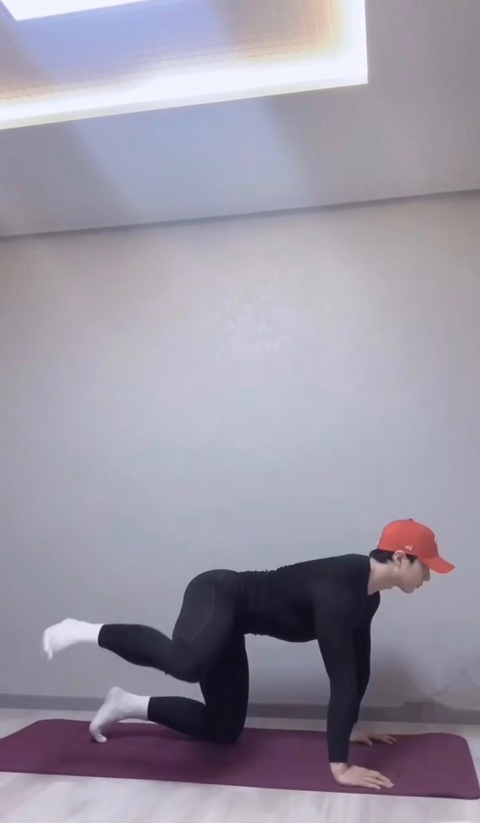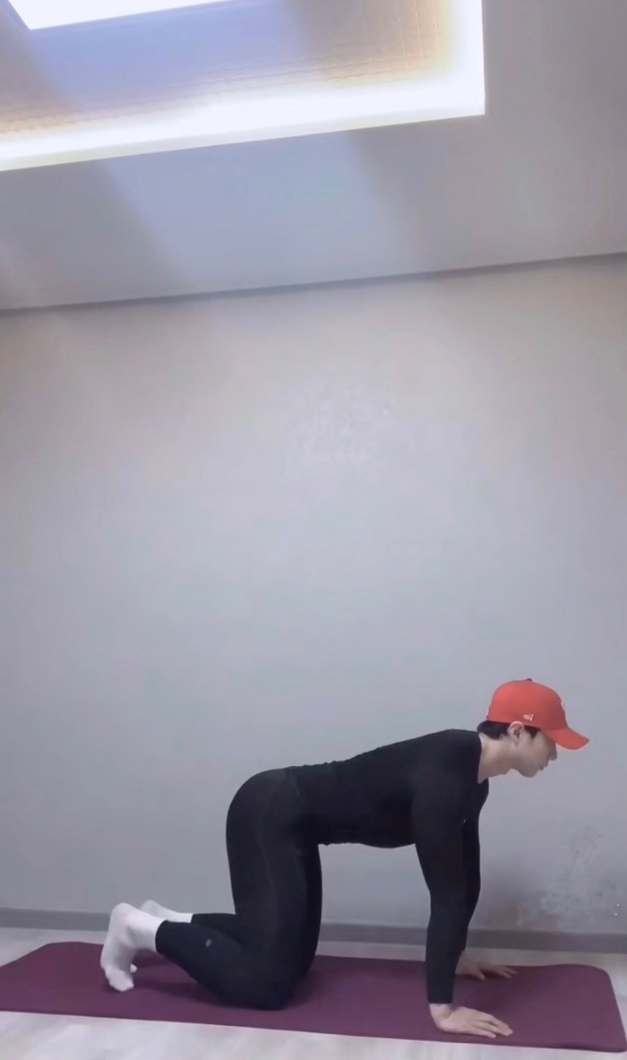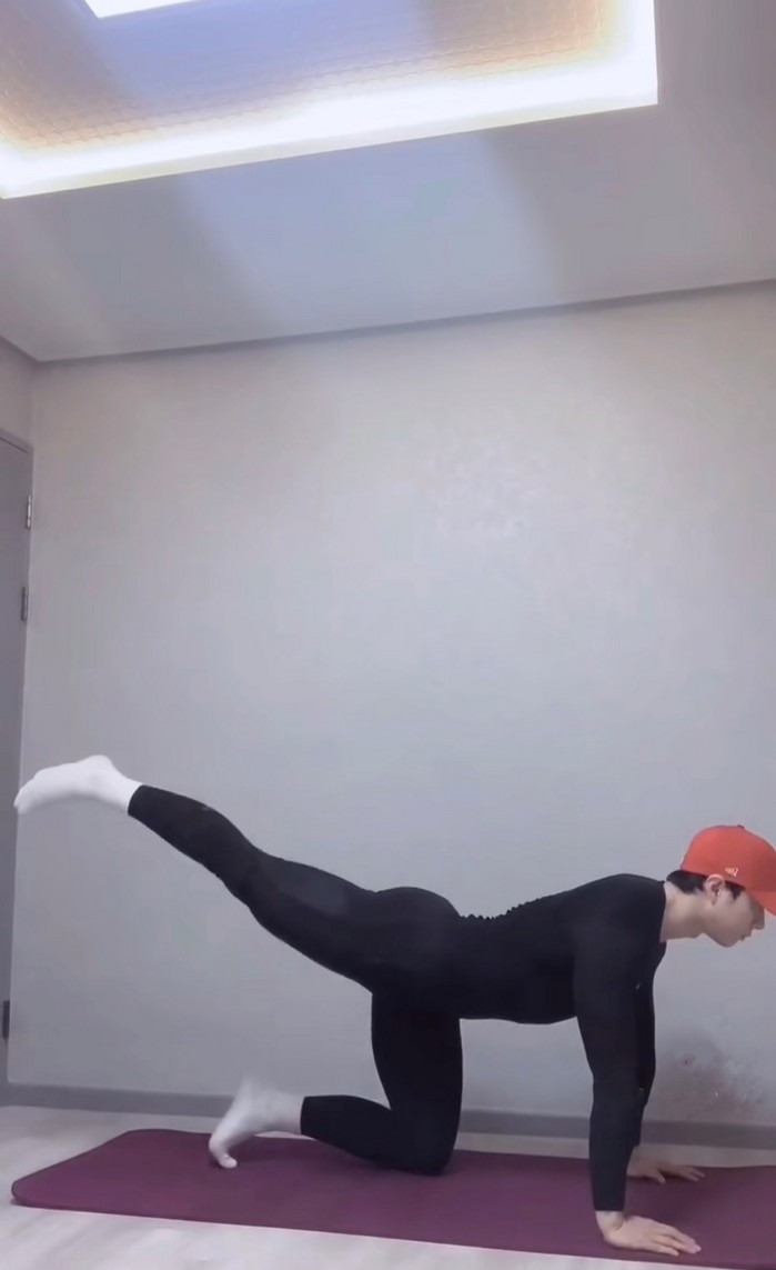 -동일한 자세에서 다리 한쪽 무릎을 펴준다.