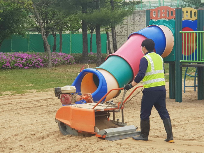 시는 먼저 토양관리기로 놀이터 모래를 15cm 깊이로 파 쓰레기나 유리. 담배꽁초 등 이물질을 제거한 후 모래를 위아래로 뒤섞어 통기성을 높이고 수분을 배출시킬 예정이다. 이어 고온스팀장비를 이용해 살균 및 기생충란 제거 작업을 실시한다. 모래뿐만 아니라 놀이시설도 고온 소독할 예정이다.