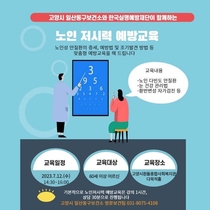 [부자동네타임즈 김인수기자] 일산동구보건소가 7월 12일 고양시 거주 60세 이상 어르신을 대상으로 ‘찾아가는 노인 저시력 예방교육’을 진행한다.