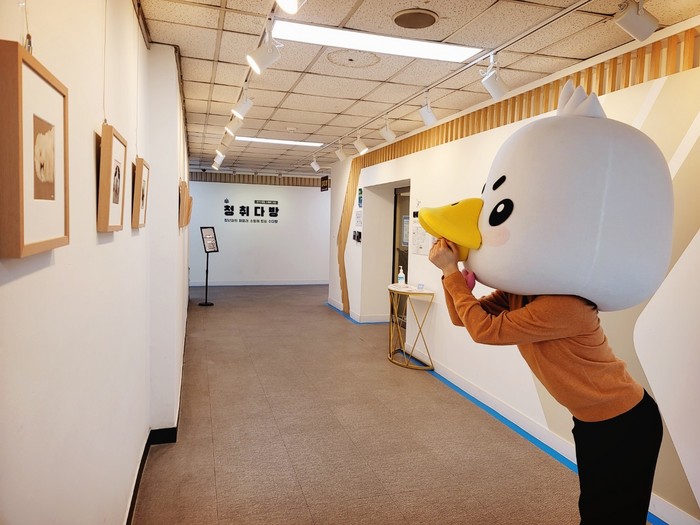 [사진설명] 청취다방 마스코트 디디가 청취갤러리의 작품을 감상하고 있다.