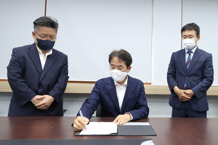 [사진설명] 이동환 시장이 ‘경제자유구역 추진단 구성 계획’을 1호 공식문서로 결재하고 있다. (22.7.1.)